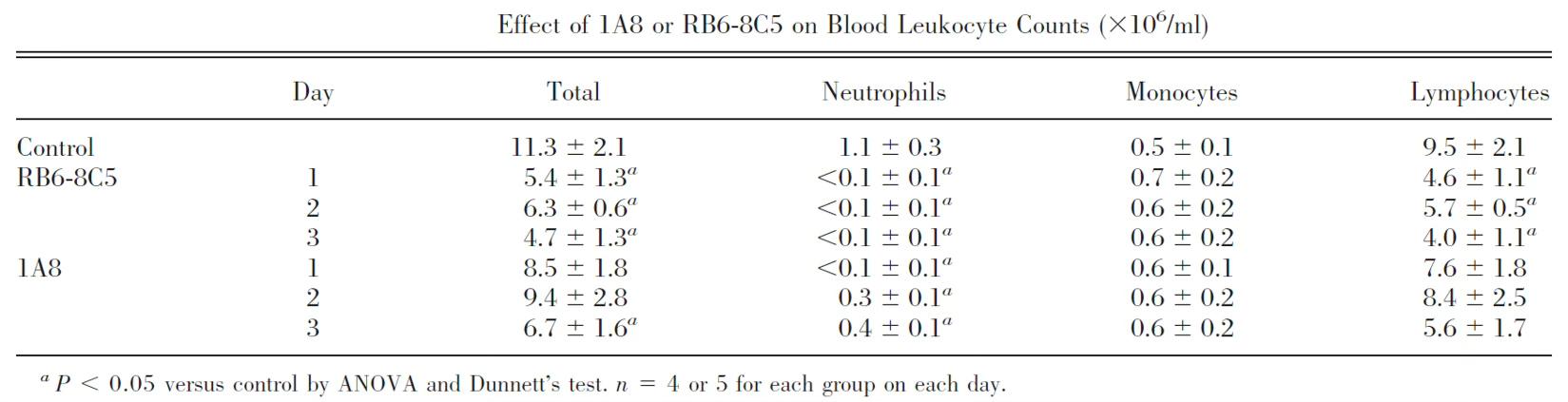 Table 1 Anti-Ly6G antibody 1A8 depletes neutrophils in mice more specifically than anti-Gr-1 antibody RB6-8C5 with less effect on blood lymphocytes [4].