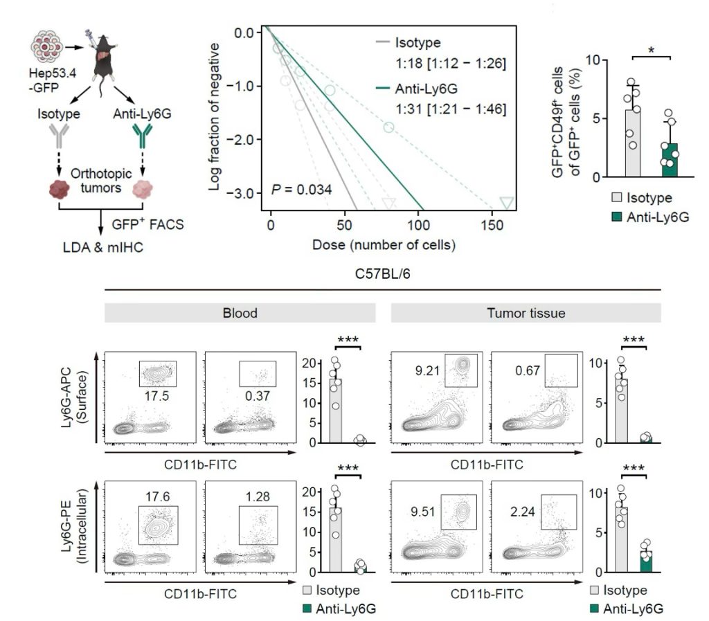 Figure 2 Upper row from left to right, schematic illustrating the process of determining whether neutrophils influence tumorigenicity, extreme limiting dilution analysis measuring the tumorigenic potential of Hep53.4 cells, and abundance of CD49f+GFP+ cells. Lower row, flow cytometry analysis of blood or tumor tissues to validate neutrophil depletion efficiency in C57BL/6 mice, n=6 mice/group.