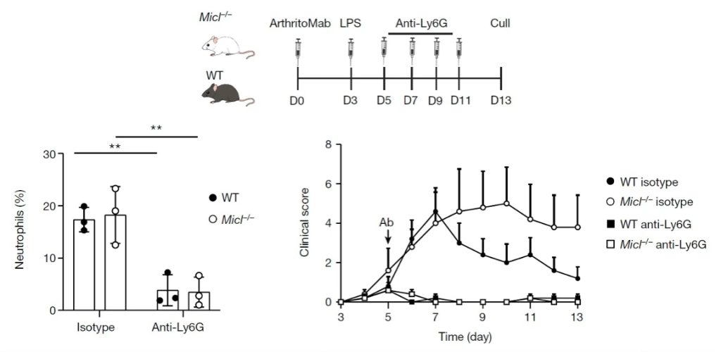 To investigate whether neutrophils were solely responsible for the exacerbated disease in Micl-/- mice, the authors successfully depleted circulating neutrophils via administering of 500µg of anti-Ly6G antibody (clone 1A8, Bio X Cell) or rat IgG2a isotype control to mice every 48 hours from day 5 after injection of the ArthritoMab monoclonal antibody cocktail. Notably, wild type and Micl-/- mice showed a significant and equivalent reduction in clinical disease following neutrophil depletion, indicating that the elevated pathology in the Micl-/- mice is stemming from neutrophils.