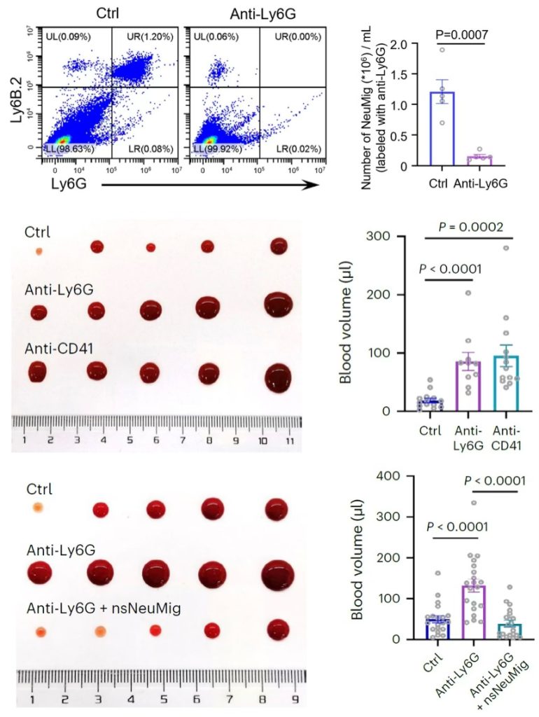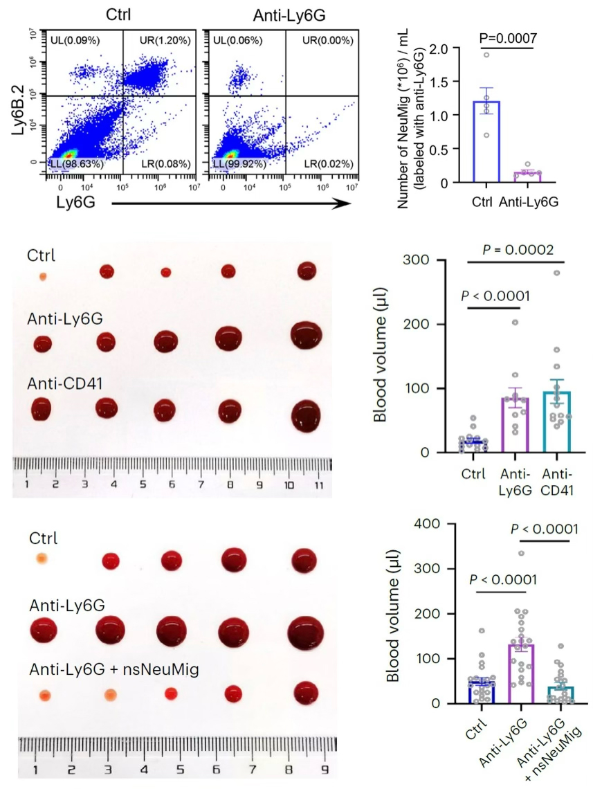 Figure 4 Upper row, flow cytometry analysis of mouse whole blood cells, and quantification of the number of neutrophil-derived migrasomes revealed by imaging-flow cytometry analysis. Middle row, tail tip bleeding assay in control, neutrophil-depleted (anti-Ly6G) and platelet-depleted (anti-CD41) mice. Lower row, tail tip bleeding assay in control, neutrophil-depleted (anti-Ly6G) mice and mice injected with neutrophil-derived migrasomes.