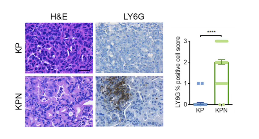 Figure 5 IHC images and quantification of positive cells in FFPE sections of KrasLSL-G12D/+;Trp53fl/fl (KP) and KrasFSF-G12D/+;Trp53Frt/Frt;Rosa26FSF-CreERT2;Nkx2-1fl/fl (KPN) mouse tumors using 1:1500 dilution of InVivoMAb anti-mouse Ly6G [11].