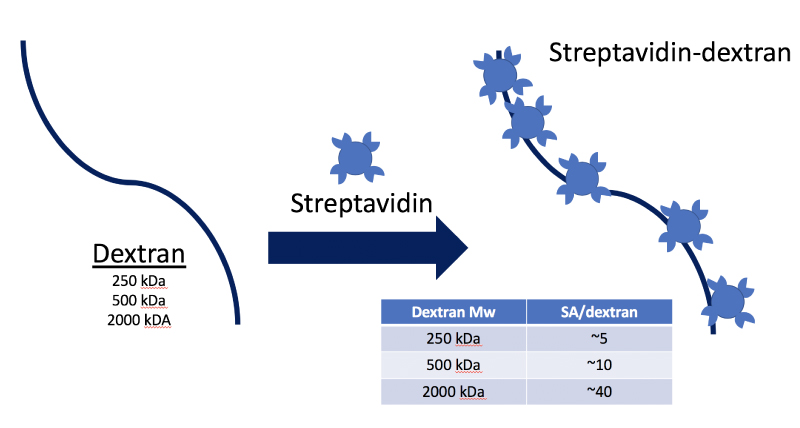 Fina Biosolutions社のStreptavidin-dextranは、250 kDa、500 kDaまたは 2000 kDaのデキストランの骨格から成ります。このコンジュゲートはサイズ排除クロマトグラフィーによってコンジュゲートされていない分子を除去して精製されます。割合や構成のカスタマイズ、バルク品のご要望がございましたら、(株)東京未来スタイルまでお問い合わせください。