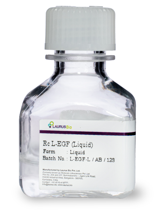 上皮成長因子(EGF)は、EGFRへの結合と下流における複数の細胞シグナルカスケードの活性化によって、細胞成長と分化を刺激するポリペプチドの有糸分裂促進型の成長因子です。EGFは、胎児の成長と発達、神経調節、グルコース輸送、核酸合成といった生物学的機能の調節において、重要な役割を果たします。Laurus Bio社のEGF-Lは大腸菌で発現する106アミノ酸長であり、ヒトEGF配列に加えて、N末端の配列に53のアミノ酸を含んでいます。