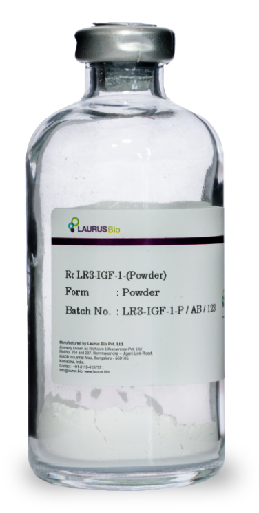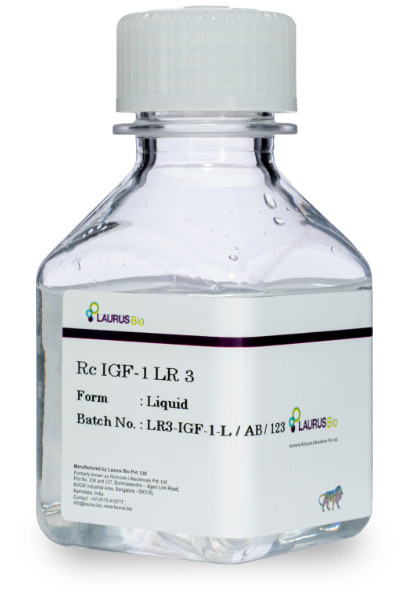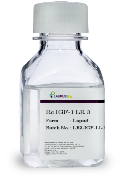 IGF-1は有糸分裂促進型の成長因子であり、細胞の増殖と生存の刺激剤です。IGF1-LR3はヒトIGF-1の伸長されたアナログであり、より高い成長促進活性を持つインスリン遺伝子ファミリーの1種です。IGF1-LR3はポジション3のグルタミン酸と代わるアルギニンであり、13個のアミノ酸の付加によって半減期を伸ばします。Laurus Bio社のIGF1-LR3は大腸菌で発現する83アミノ酸長です。