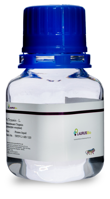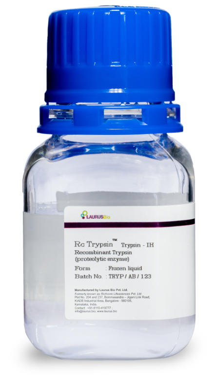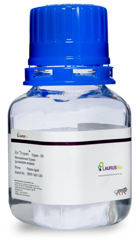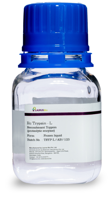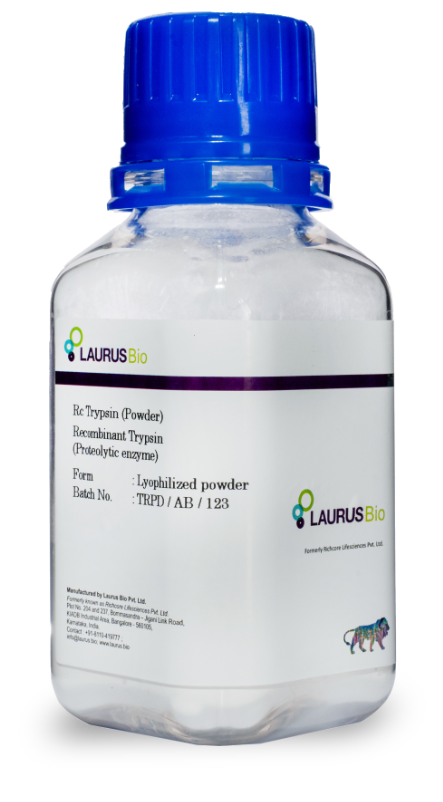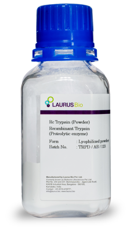 一本鎖のタンパク質であるトリプシンは、セリン・プロテアーゼS1ファミリーの1種です。Laurus Bio社の製品は、ピキア酵母で発現させた223アミノ酸長であり、トリプシノーゲンからN末端のヘキサペプチドを取り除くことで生成されます。天然型のトリプシンは、β-トリプシンと呼ばれ、α-トリプシンはそれの加水分解から生成されます。このプロテアーゼはpH 7~9において最適な活性を持ち、C末端上のリシンとアルギニン残基でペプチドを分解します。USP(アメリカ薬局方)規格のトリプシンは、α:β比が定義されています。